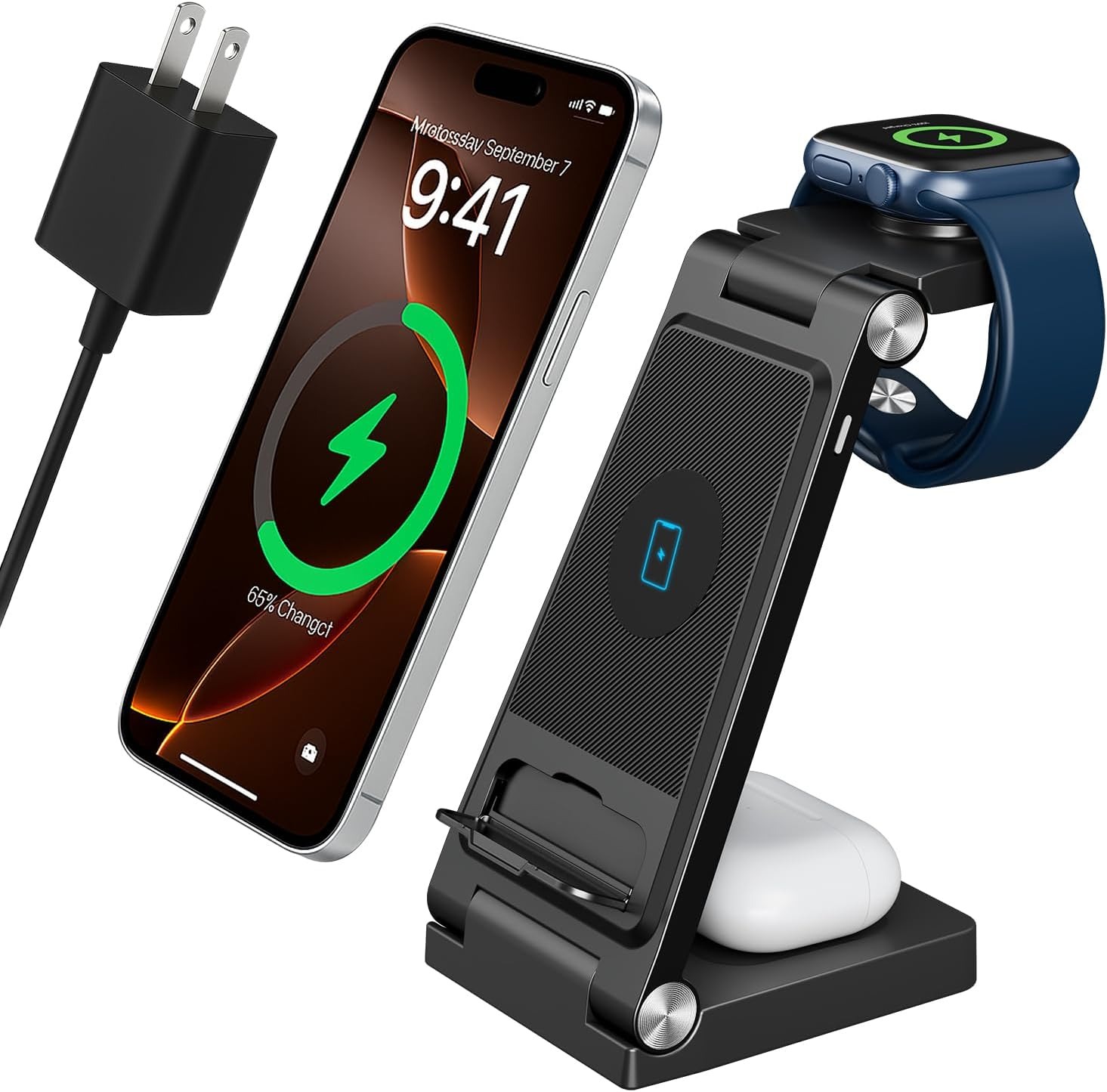 3-in-1 charging solution powers iPhone, Apple Watch, and AirPods all at once with a built-in adjustable stand.